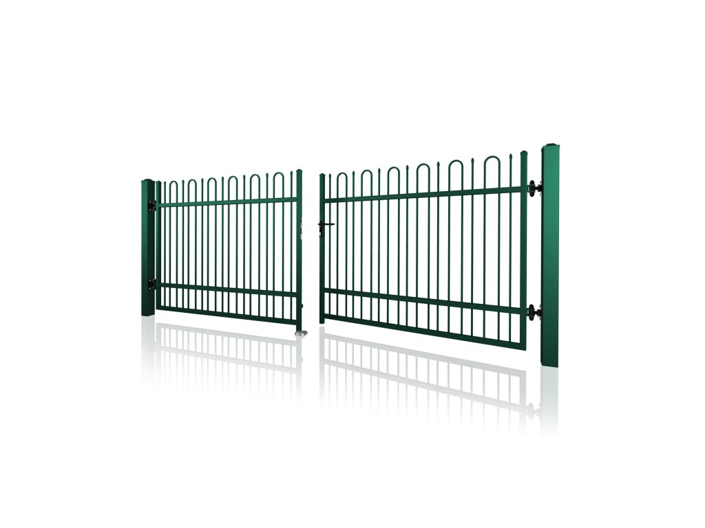 Dvoukřídlá brána STYLE 10-08, kovaná, bezúdržbová, na míru (šířka 1500–6000 mm, výška 1000–1750 mm), zelená RAL 6005 matná