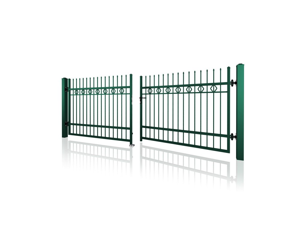 Dvoukřídlá brána STYLE 10-25, kovaná, bezúdržbová, na míru (šířka 1500–6000 mm, výška 1000–1750 mm), zelená RAL 6005 matná