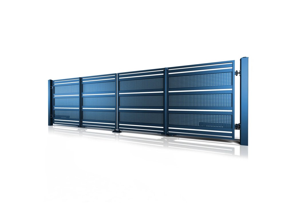 Dvoukřídlá skládací brána 10-109, ocelová, bezúdržbová, na míru (šířka 1200 - 6000 mm, výška 1200 - 2100 mm), modrá 5010 matná