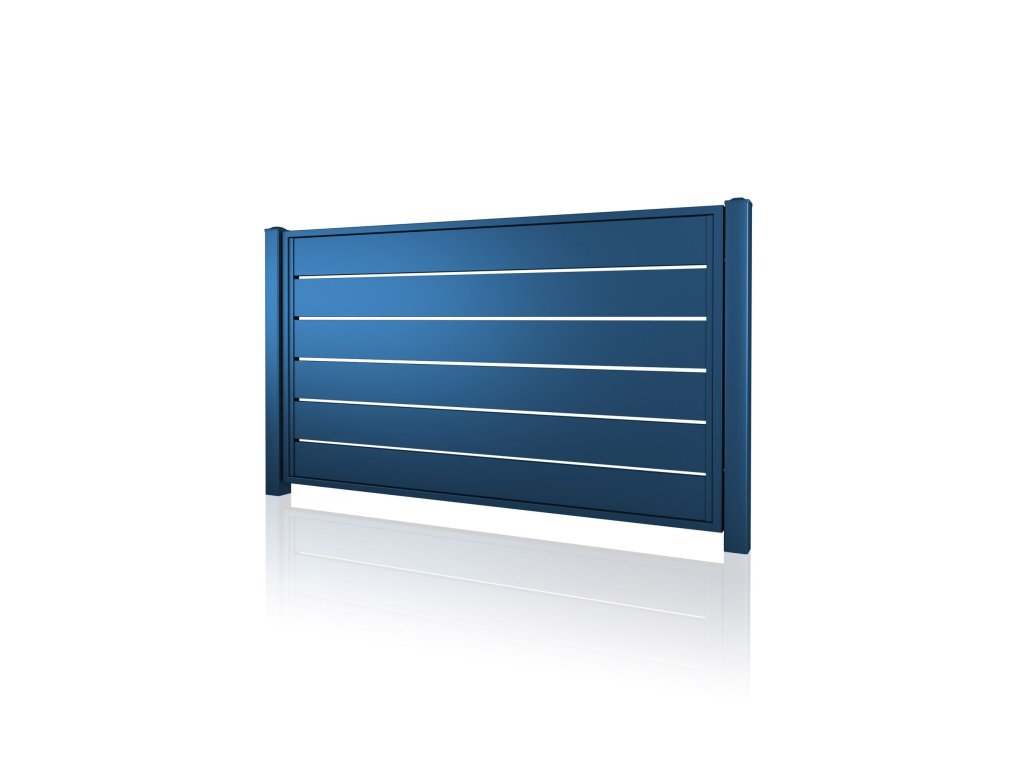 Plotové pole 10-228, ocelové, bezúdržbové, s mezerou, na míru (šířka 500–3000 mm, výška 550–2050 mm), modrá RAL 5010 matná