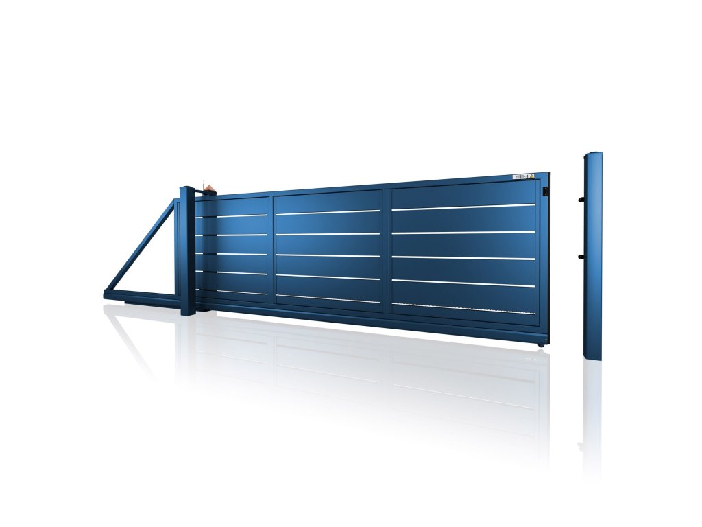 Samonosná posuvná brána 10-228, ocelová, bezúdržbová, s mezerou, na míru (šířka 2400 - 6000 mm, výška 1050 - 2050 mm), modrá 5010 matná