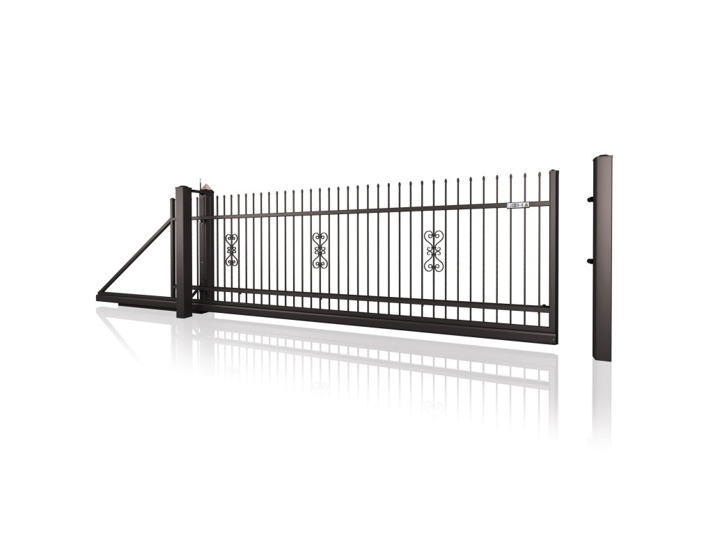 Samonosná posuvná brána STYLE 10-09, kovaná, bezúdržbová, na míru (šířka 1500–6000 mm, výška 1100–1750 mm), hnědá RAL 8019 matná