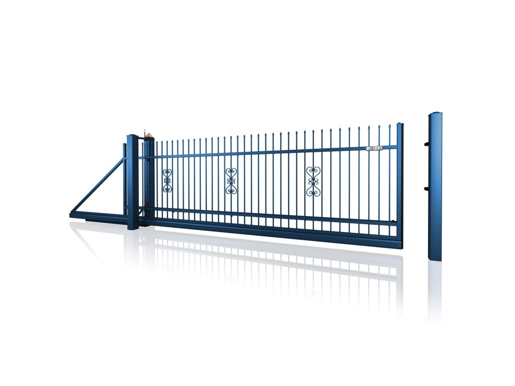 Samonosná posuvná brána STYLE 10-09, kovaná, bezúdržbová, na míru (šířka 1500–6000 mm, výška 1100–1750 mm), modrá RAL 5010 matná