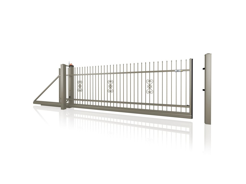 Samonosná posuvná brána STYLE 10-09, kovaná, bezúdržbová, na míru (šířka 1500–6000 mm, výška 1100–1750 mm), šedá RAL 7030 matná