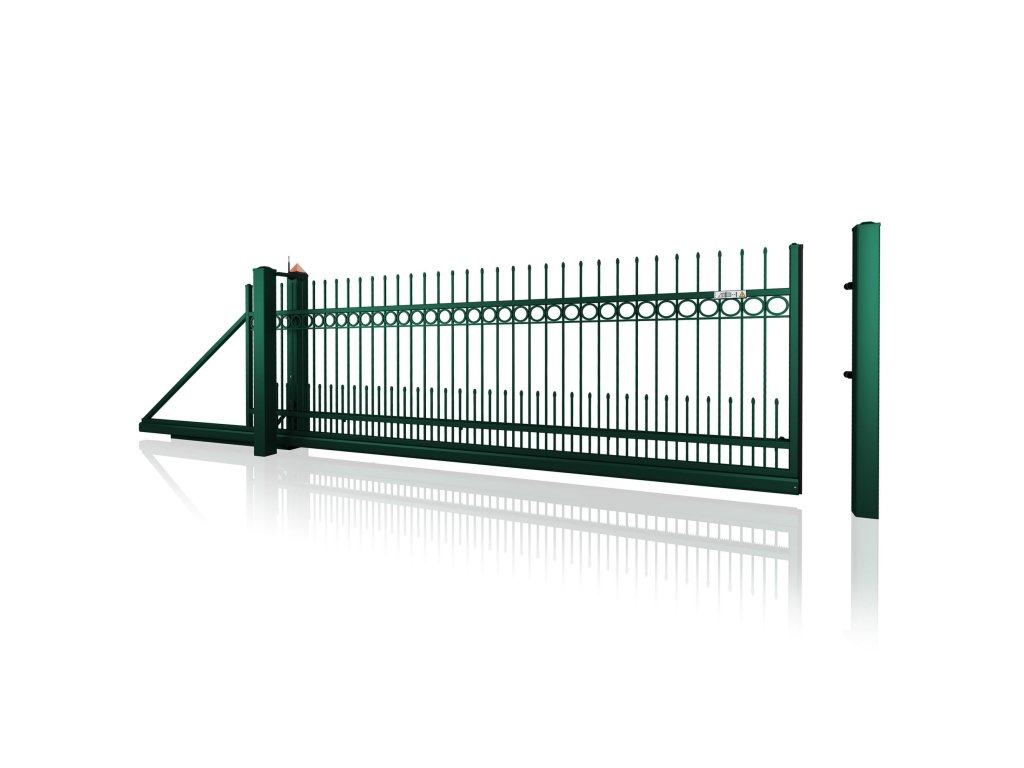 Samonosná posuvná brána STYLE 10-12, kovaná, bezúdržbová, na míru (šířka 1500–6000 mm, výška 1000–1750 mm), zelená RAL 6005 matná
