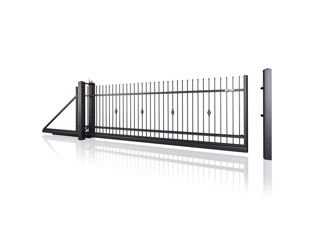 Samonosná posuvná brána STYLE 10-22, kovaná, bezúdržbová, na míru (šířka 1500–6000 mm, výška 1100–1750 mm), černá RAL 9005 matná