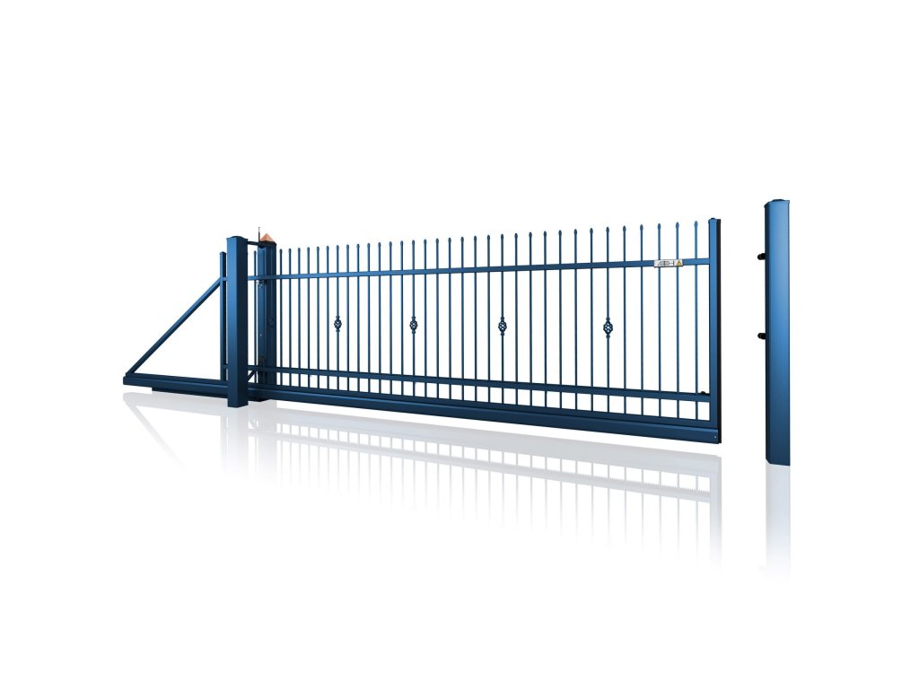 Samonosná posuvná brána STYLE 10-22, kovaná, bezúdržbová, na míru (šířka 1500–6000 mm, výška 1100–1750 mm), modrá RAL 5010 matná