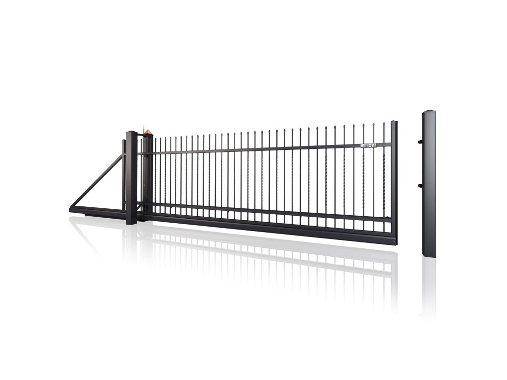Samonosná posuvná brána STYLE 10-23, kovaná, bezúdržbová, na míru (šířka 1500–6000 mm, výška 1100–1750 mm), černá RAL 9005 matná