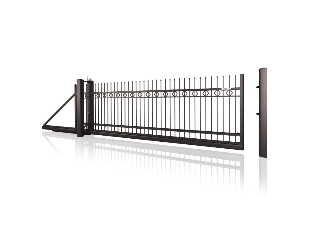 Samonosná posuvná brána STYLE 10-25, kovaná, bezúdržbová, na míru (šířka 1500–6000 mm, výška 1000–1750 mm), hnědá RAL 8019 matná