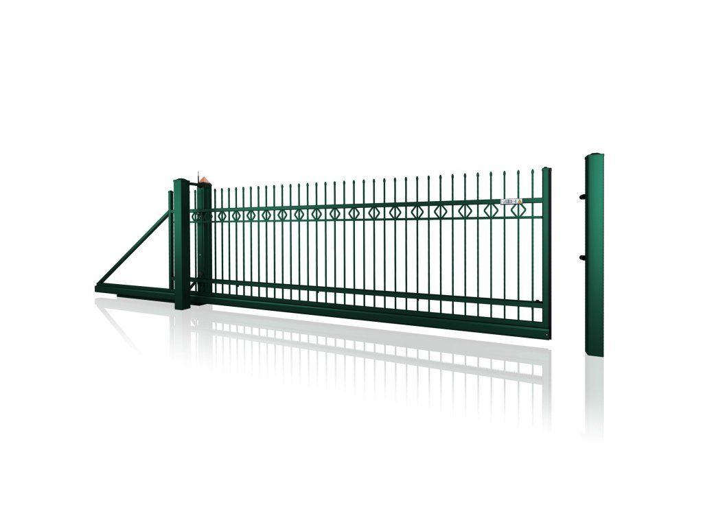 Samonosná posuvná brána STYLE 10-25, kovaná, bezúdržbová, na míru (šířka 1500–6000 mm, výška 1000–1750 mm), zelená RAL 6005 matná